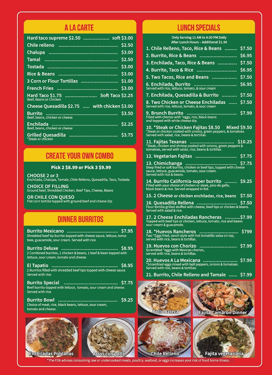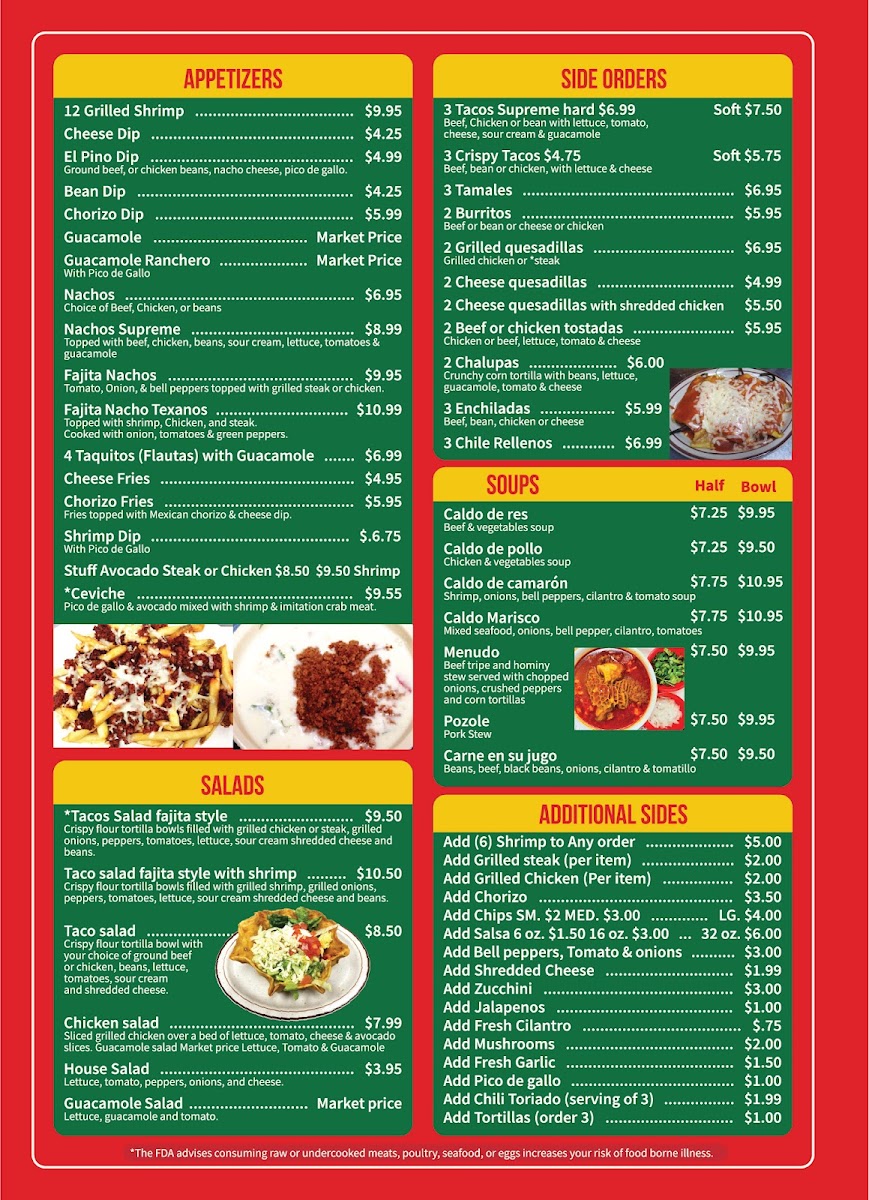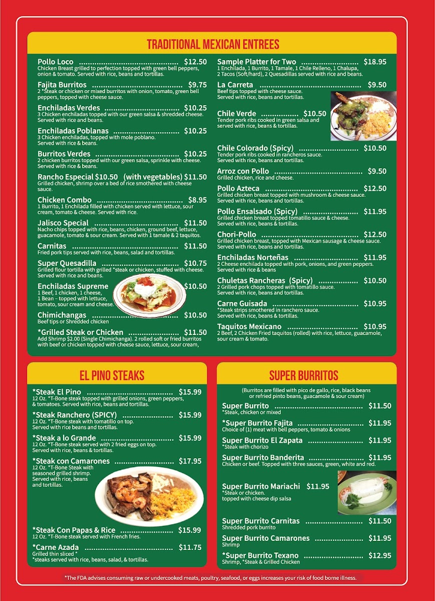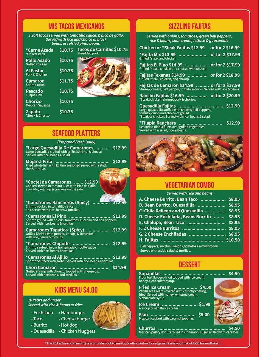 At El Pino Mexican Restaurant, located in Fredericksburg, VA, vibrant flavors take center stage in a delightful culinary journey through authentic Mexican cuisine. The menu features a variety of tantalizing options, from Sizzling Fajitas to comforting Caldo Soups, each crafted with fresh ingredients that resonate with traditional tastes.